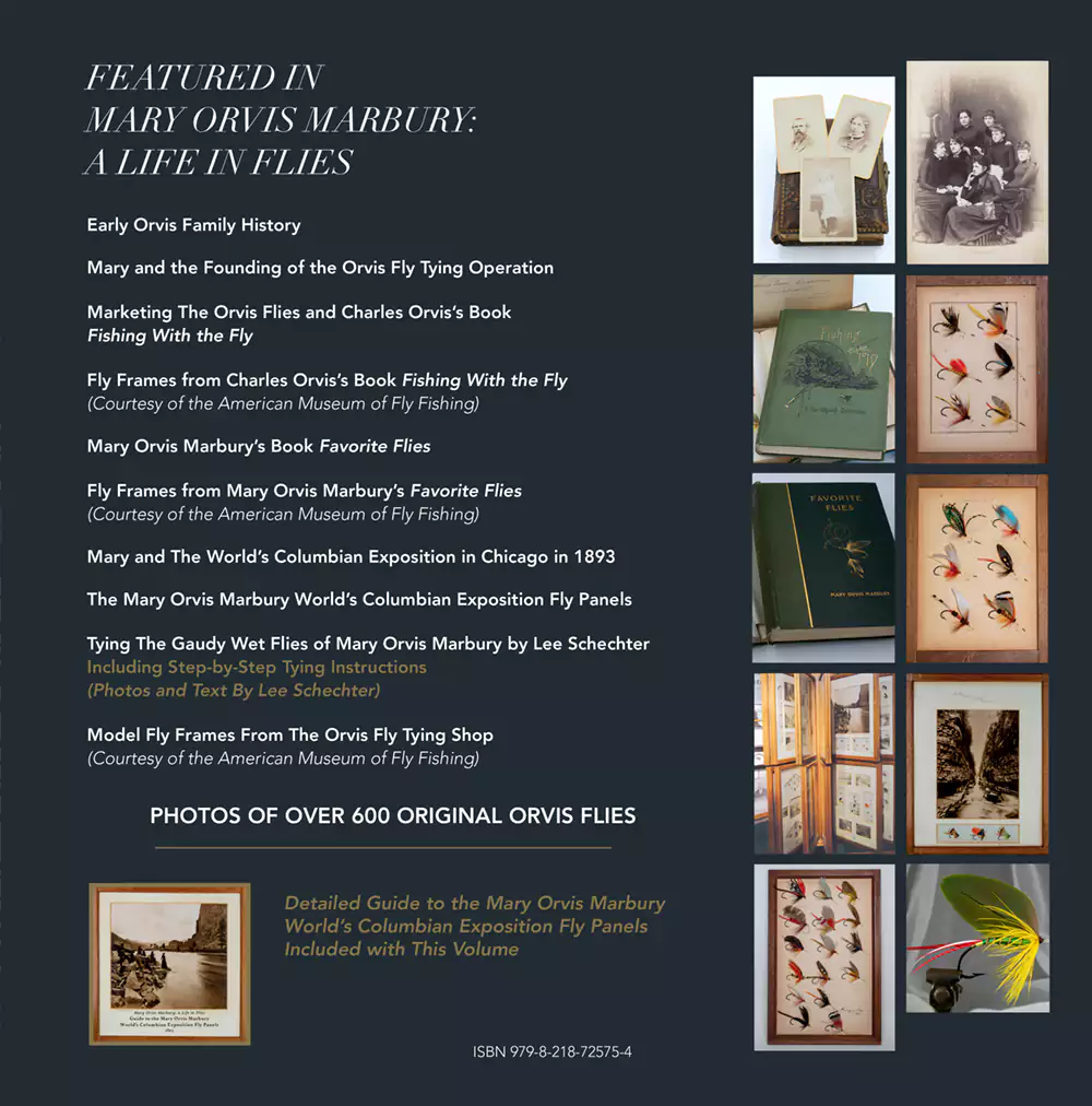 Mary Orvis Marbury: A Life in Flies features, for the first time in print, the largest collection of original early Orvis trout, bass, lake and salmon flies. The collection includes the flies and photographs of the complete set Mary Orvis Marbury World’s Columbian Exposition panels as well as a sampling of the plates of flies included in Mary’s book Favorite Flies and the book Fishing With the Fly by her father Charles and his co-author Albert Nelson Cheney.